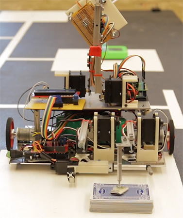 Sims and his fellow students began work on their robot – lovingly named “Betsy” – when competition rules were announced in October 2014. Their autonomous robot had to run through a maze and complete four retro-themed tasks: play Simon Says for 15-seconds, rotate a Rubik’s Cube section 180 degrees, write “IEEE” on an Etch a Sketch, and remove the top card of the deck. The robot had to drive itself up to each game, physically manipulate the game correctly, and complete all four in five minutes.