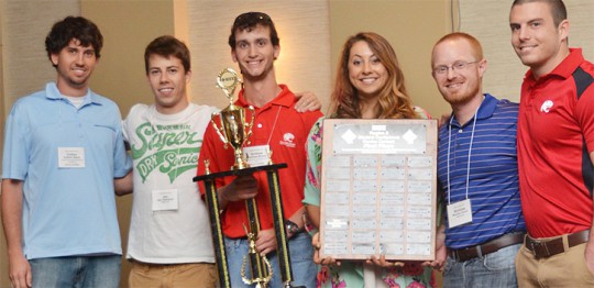 Pictured top: University of South Alabama students accepting their trophy at the 2015 IEEE SoutheastCon Awards Banquet. From left, Northview graduate Colton Sims and fellow students Jan Hellmich, Andrew Braun, SoutheastCon Representative, Nicholas Carroll, and Kenneth Leggett. Pictured inset: The team’s robot “Betsy”. Courtesy photos for NorthEscambia.com, click to enlarge.