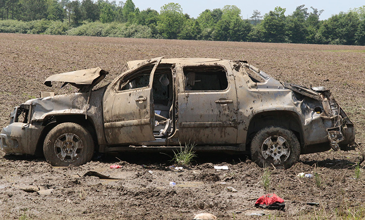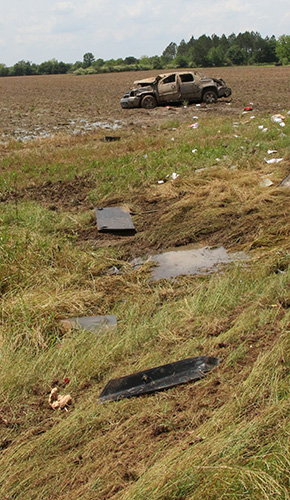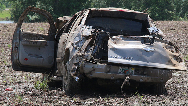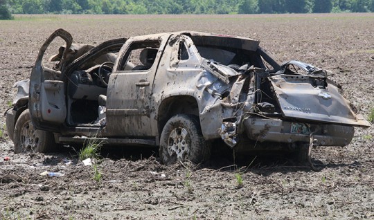 The driver of a Chevrolet Avalanche was northbound on Highway 97 when he apparently ran off the shoulder of the road, over-corrected, crossed back over the highway and then flipped the vehicle numerous times into a muddy field.
