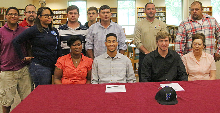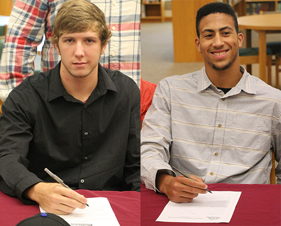 Two Northview High School seniors signed football letters of intent Thursday. Cameron Newsome (right) signed with Waldorf College in Iowa, and Nick Lambert signed with Faulkner University in Montgomery. NorthEscambia.com photos, click to enlarge.