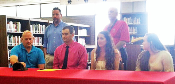 Former Cantonment Cowboy and now West Florida High School senior Brandon Hicks has signed with Huntingdon College in Montgomery. Pictured: Brandon Hicks (in tie), his mother and father David and Kelli Hicks, sister Cheyenne Hicks and (standing) Coach Harry Lees and and West Florida Principal Eric Smith. Submitted photo for NorthEscambia.com, click to enlarge.