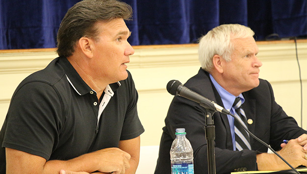 Pictured top: A town hall meeting in Molino Monday evening. Pictured inset: Commissioner Steven Barry. Pictured below: Public Works Director Wes Moreno and County Administrator Jack Brown. NorthEscambia.com photos, click to enlarge.