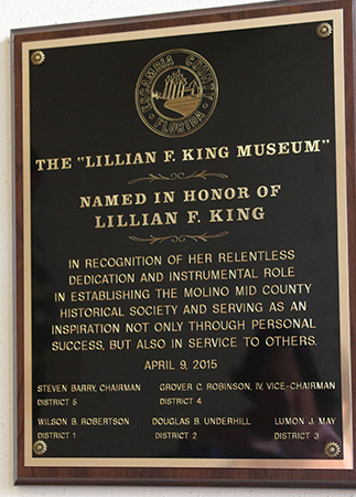 The Molino Mid-County Historical Society Museum in Molino was officially dedicated Monday afternoon as the “Lillian F. King Museum”. The museum was renamed in the honor of Lil King, who was instrumental in the establishment of the Molino Community Complex — housing the museum, the Molino Branch of the West Florida Public Library, multiple meeting rooms, and an auditorium — in the former Molino Elementary School.