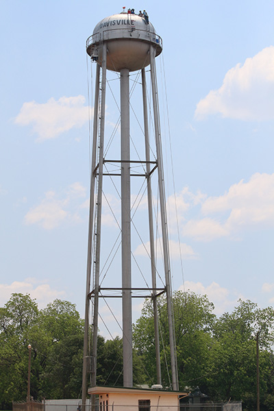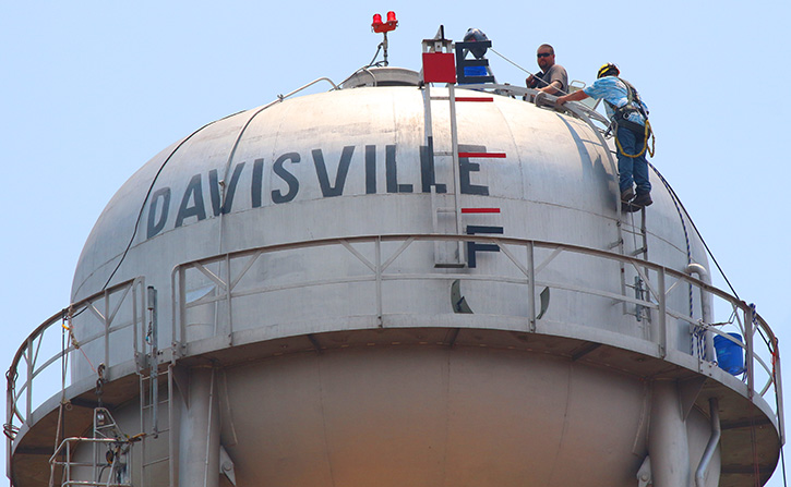 “Actually EREC owns this service now” But it is still the “Bratt-Davisville Water System”. From the trucks on the ground, this appeared to be a contractor, not EREC, doing the work. The guy with no helmet is standing *inside* the tank and out a trap door.