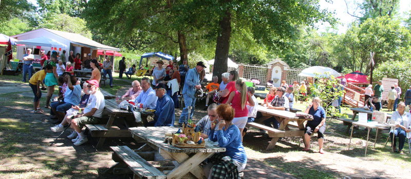 Pictured top: A spinning and yarn making demonstration. Pictured inset: Replacing cane on a circa 1939 dining room chair. Pictured below: Enjoying entertainment Saturday morning at Century’s Sawmill Festival. NorthEscambia.com photos, click to enlarge.