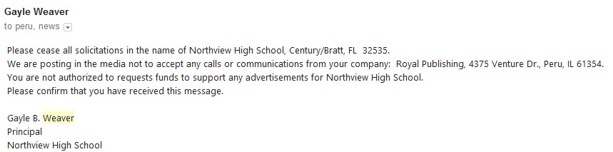 Principal Gayle Weaver said Royal Publishing has contacted local organizations and solicited funds for the Northview baseball team. She said those funds will not benefit the team in any manner, and any representation of the school or team by the company is unauthorized.