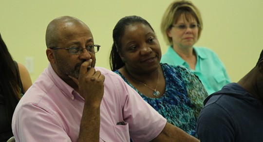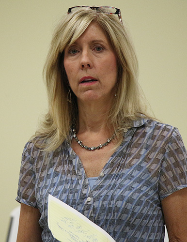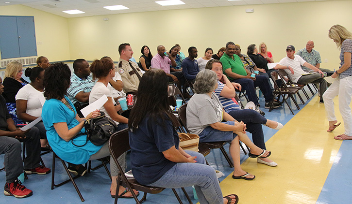 Pictured top and bottom: Reimagine Century volunteers meet Tuesday night in Century. Pictured inset: Reimagine founder Linda English. NorthEscambia.com photos, click to enlarge.