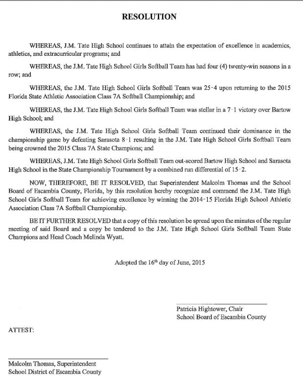 The 2015 Class 7A state softball champion Tate Lady Aggies were honored Tuesday evening by the Escambia County School Board. To read the entire proclamation, click the proclamation image below to enlarge. Courtesy images for NorthEscambia.com, click to enlarge.