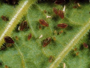 Aphids are soft-bodied, sucking insects that can rapidly colonize plants due to their short life cycle. Adults are delicate, pear- or spindle-shaped insects with a posterior pair of tubes (cornicles), which project upward and backward from the end of the abdomen and which are used for excreting a defensive fluid. In Florida, winged and wingless forms are all female and give birth to living young (nymphs). Nymphs are smaller but otherwise similar in appearance to wingless adults, which they become in 7 to 10 days.