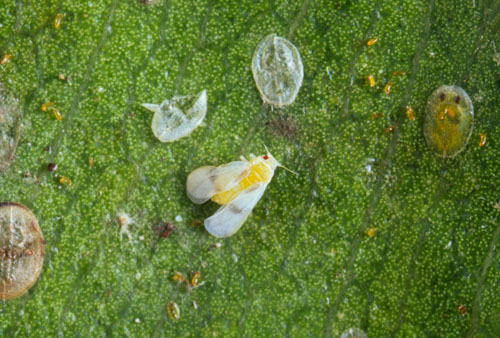The adult silverleaf whitefly is small, approximately 1/16 of an inch in length, and has powdery white wings held tent-like while at rest over a yellow body. Whiteflies are usually found on the undersides of leaves. Eggs, which are yellow and football-shaped, are attached upright by a tiny stalk inserted into the lower leaf surface. A mobile first instar (growth stage), or crawler stage, hatches from the egg and settles on the leaf. It then develops through immobile second, third, and fourth instars which look like semi-transparent, flat, oval scales. The fourth instar or “pupa” is more yellow and more easily seen without the aid of a hand lens, and typically has very distinct eyespots, and is referred to as a “red-eyed nymph.”