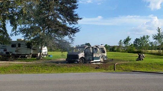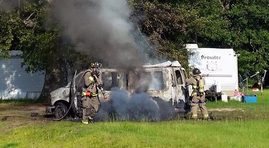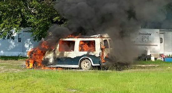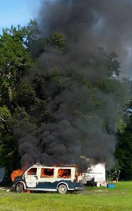 Fire destroyed a van late Saturday afternoon on Rocky Branch Road off Quintette Road. The van was fully involved when firefighters arrived on scene, but they were able to prevent the fire from spreading to neighboring structures. NorthEscambia.com photos by Kristi Price, click to enlarge.