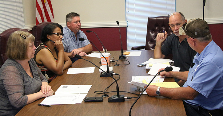 Pictured: Century Street Department Director Larry Murphy (blue shirt) discusses his budget with council members (L-R) Ann Brooks, Sandra McMurray Jackson and Ben Boutwell, and (right) accountant Robert Hudson during a previous budget workshop. NorthEcambia.com photo, click to enlarge.