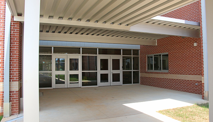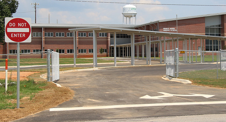 From the public parking lot the front of the school looks like this. Over on the bottom left of the photos, at the end of the awning, is the elusive front door of Ernest Ward Middle School. The awning, and the driveway that loops around by the front door, is the student drop-off and pick-up line for parents.