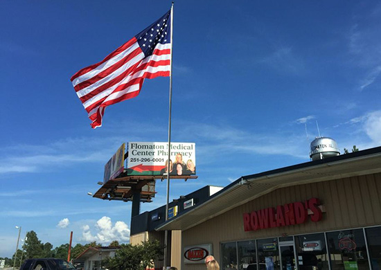 Flomaton is patriotic small town with a big heart– and now a really big American flag. The giant American flag was raised Thursday the intersection of Highway 113 and Highway 31.
