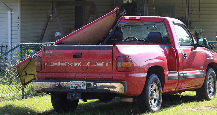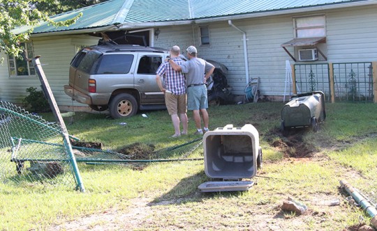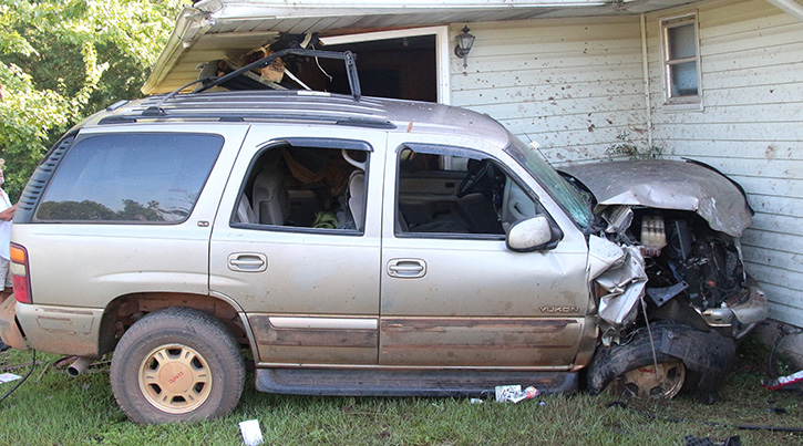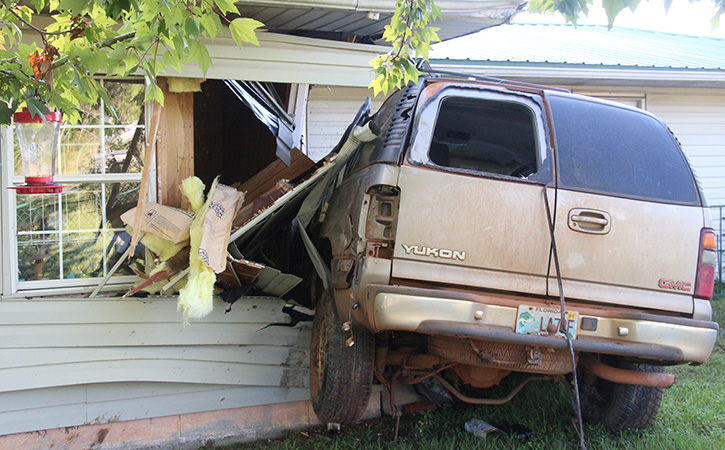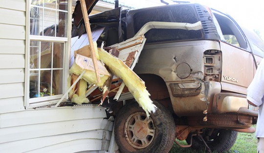 The Yukon then struck left the roadway, struck a culvert and went airborne, colliding with the bed cover on top of the bed of a 2001 Chevrolet Silverado that was legally parked in a driveway. The Yukon then continued through a fence and into the house. Part of the Yukon ended up in the living room of the home and struck the outside wall of a bathroom where resident Edna Darby said she was just getting into her bathtub.
