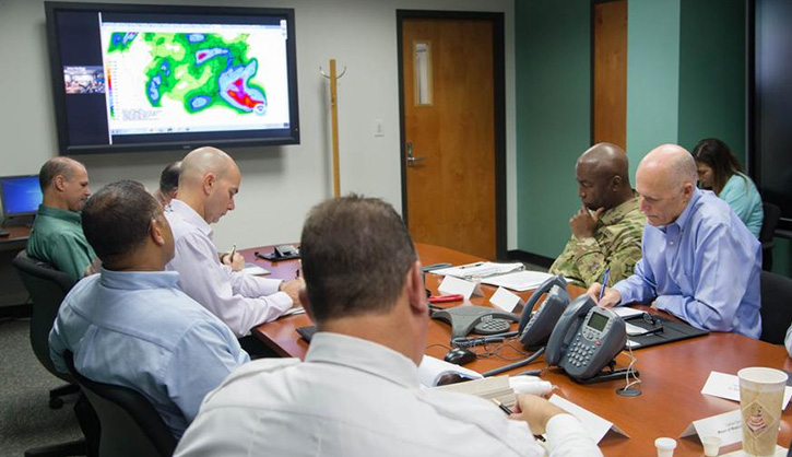Pictured below: Gov. Rick Scott is briefed on Tropical Storm Erika on Friday.