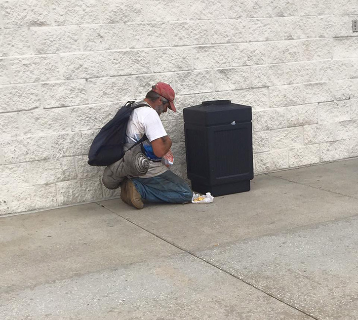 An Atmore elementary school principal, John Brantley, watched as the man, down on his knees, checked fast food bags in the garbage can outsid the Mobile Best Buy store. The man found a few fries here, a few bites of a an old leftover burger there. The man never solicited those passing by him for money and cleaned up the area when he was done.