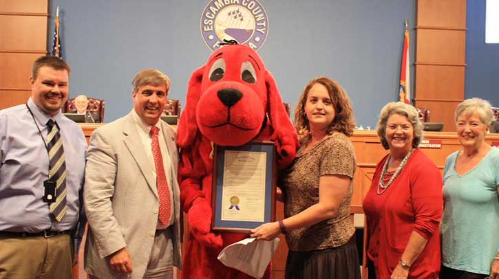 September was proclaimed “Library Card Sign-Up Month” in Escambia County, urging all residents to obtain a library card and use the services of the West Florida Public Libaries. Clifford the Big Red Dog stopped by the Escambia County Commission Meeting as the proclamation was approved and presented. Courtesy photo for NorthEscambia.com, click to enlarge.