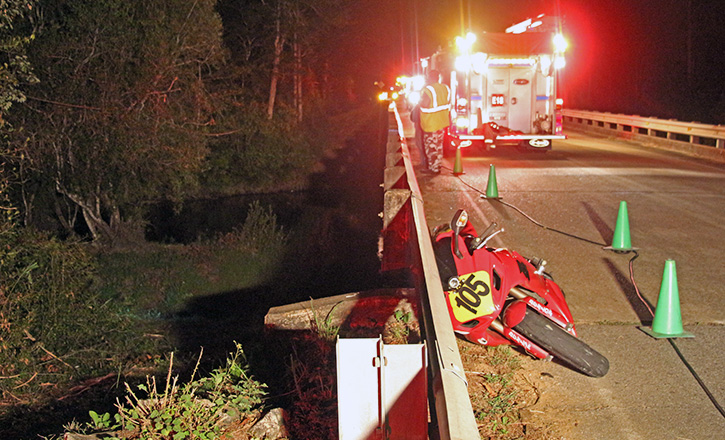 Motorcyclist Hits Guardrail, Thrown Off Bridge