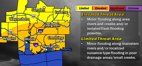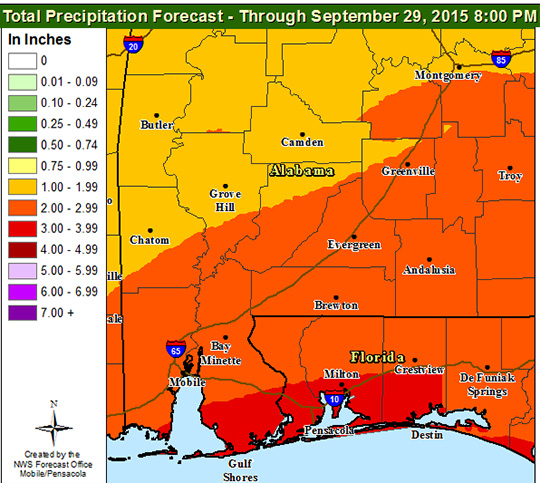 Regardless of tropical development, forecasters expect local impacts to be primarily heavy rain, rough surf, and an increase in potentially life threatening rip currents. According to the National Weather Service Office in Mobile, up to 2-4 inches of rain can be expected across the southern half of the area with locally higher amounts possible.