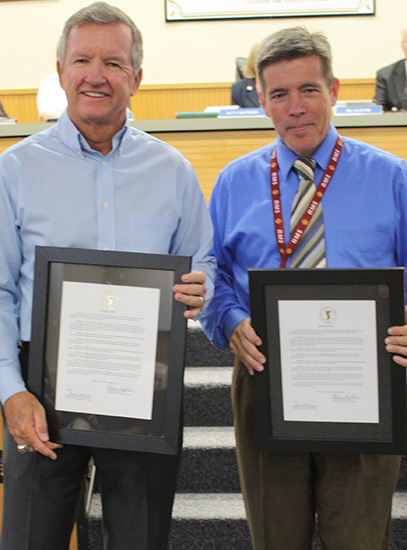 Pictured: Joseph E. Murphy (left) with Ransom Middle Principal Brent Brummet at an Escambia County School Board meeting last month. File photo.