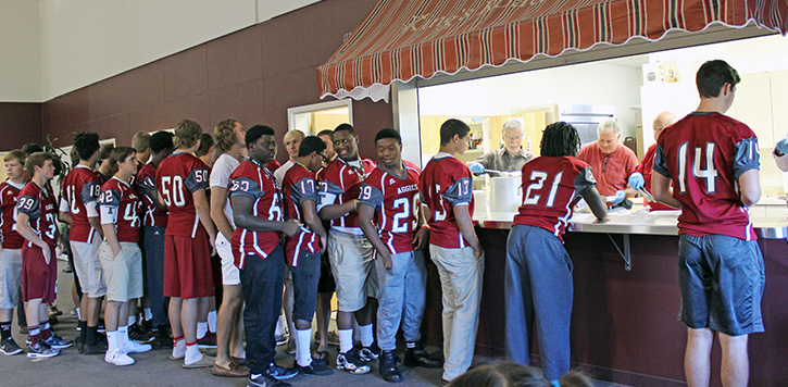 Pictured top and bottom. Tate Aggies football players enjoy a breakfast Friday morning at Gonzalez Methodist Church. Pictured inset: Church volunteeer Tammie Penegar. Submitted photos for NorthEscambia.com, click to enlarge.