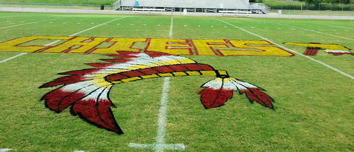 Pictured: The football field painted at Tommy Weaver Memorial Stadium in Bratt as the Chiefs are ready to host Vancleave, MS, tonight. The field artwork is by Wayne Holland. Photo for NorthEscambia.com, click to enlarge.