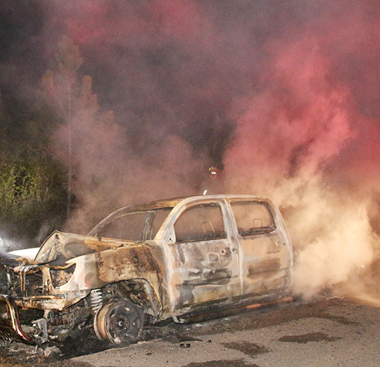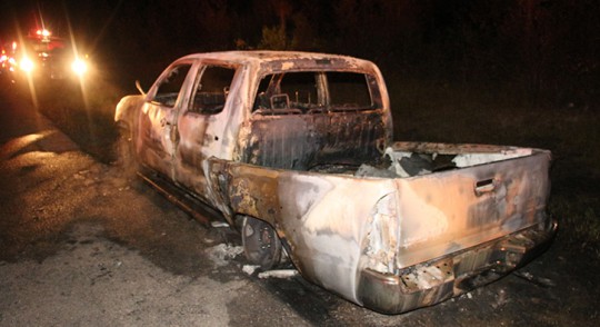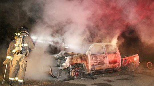 A passerby reported a pickup truck on fire alongside Pine Barren Road just south of Highway 168 about 12:40 a.m. When the Walnut Hill Station of Escambia Fire Rescue arrived, they found the Toyota Tacoma pickup destroyed and that the fire had mostly burned itself out.