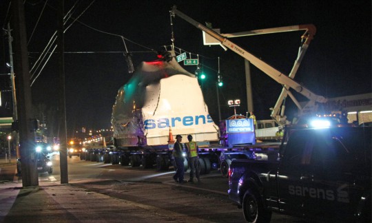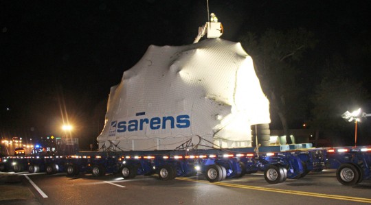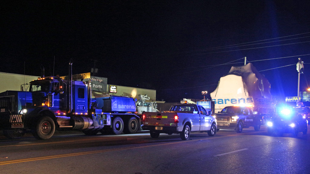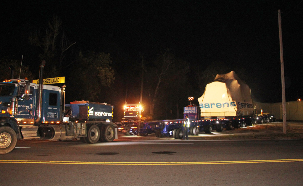 The generator turbine is on a trailer that is 18-feet wide, almost 25-feet tall and 173.5-feet long. Along the way, utility crews were forced to lift, pull or remove and estimated 400 obstructions such as power and phone lines. Some residents were without power for an hour or two overnight due to the transport, but most the of the power lines were moved “live” without service interruptions.