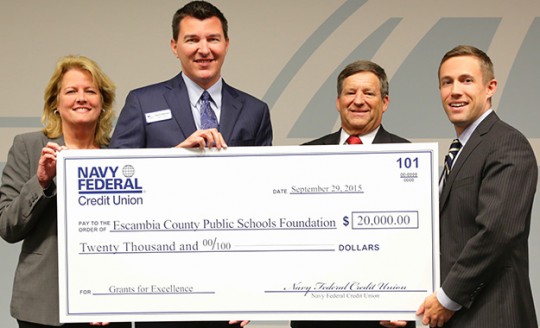 Pictured: Debbie Calder, executive vice president of Navy Federal Credit Union’s Greater Pensacola Operations; David Deliman, foundation chairman; Escambia Schools Superintendent Malcolm Thomas; and Thomas Greek, assistant vice president, Learning & Development, Navy Federal. Submitted photo for North Escambia.com, click to enlarge.