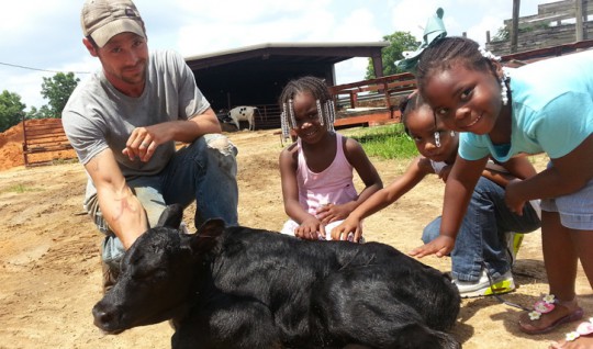 The photograph was first published on NorthEscambia.com in June 2013 showing three children from the from the day program at the Carver Community Center in Century visiting the Boyd Sigafoose Dairy in Bratt. A dairy employee is introducing the children to a young calf in the photo.