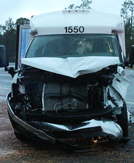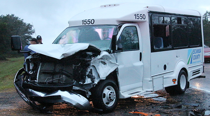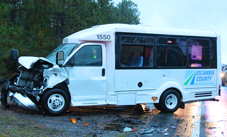 The crash happened about 5:45 a.m. on Highway 29 north of Champion Drive. According to the Florida Highway Patrol, 27-year old Ryan Joiner of Brewton was stopped in the median of Highway 29 in a 2015 Peterbuilt log truck when he initiated a turn into the direct path of a 2015 model Escambia County Community Transportation bus driven by 22-year old Nakeem Williams of Pensacola.