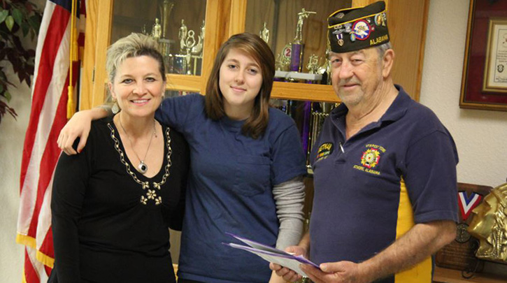 Pictured: Essay contest winner Dykota Wilson (middle), her 10th grade English teacher Vicki Baggett VFW Post 7016 Representative Noah McBride. Submitted photo for NorthEscambia.com, click to enlarge.