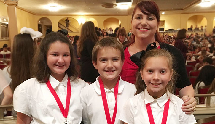 The Escambia County School District All County Chorus performed earlier this week at the Saenger Theater in Pensacola. Participants from Molino Park Elementary School included were (pictured L-R) fifth graders Shelby Lashley, Aaron Adams and Alyssa Jackson. Also pictured is Katherine Powell, Molino Park music teacher. Submitted photo for NorthEscambia.com, click to enlarge.