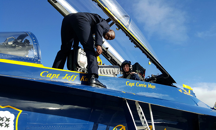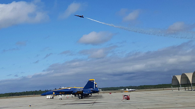 Also flying with the Blue Angels Tuesday were local Boy Scouts of America district executive Suzie West and NewsRadio 1620’s Andrew McKay. The Blue Angels will close the 2015 season at their annual Homecoming Air Show aboard