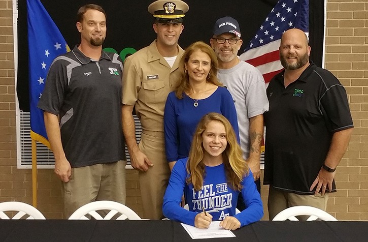 Present for the signing were her parents Mark and Virtudes Oberley and her older brother Ensign Joshua Oberley. Also attending were her coaches from the Greater Pensacola Aquatic Club, head coach Phil Kraus and head age group coach Greg Johnson. Tatiana is a senior at Pensacola Christian Academy where she carries a 4.0 GPA. She is a three time USA Swimming Scholastic All American. She currently plans to major in history at the Air Force Academy.