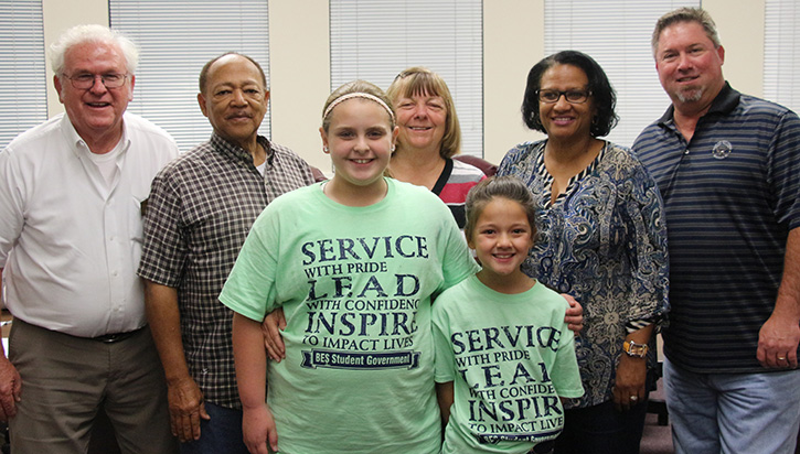 Pictured: Byrneville Student Government Association members Meredith Johnson (front left) and Alexa Castro with (back row) Mayor Freddie McCall and council members Gary Riley, Ann Brooks, Sandra McMurray Jackson and Ben Boutwell.
