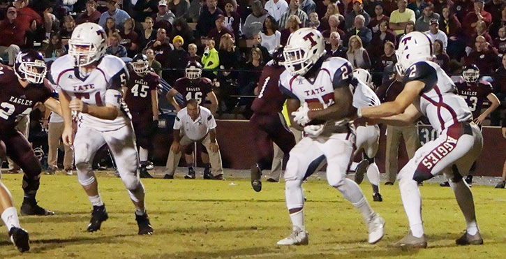 Quarterback Sawyer Smith found Reginald Payne for a 58 yard gain, setting up a two-yard touchdown run by Smith with 10:17 to go in the second quarter. And also in the second quarter, Smith hit Jake Henry for a 66-yard touchdown. The Aggies were up a comfortable 21-0 over a Niceville team that has outscored Tate 140-48 in their past five outings.
