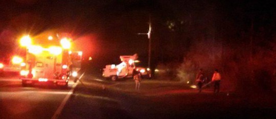 Pictured top: Firefighters extinguish a brush fire on Highway 196 in Molino Sunday night caused by a downed power line. Photo for NorthEscambia.com, click to enlarge. Pictured below.: This map from Gulf Power shows the area of a power outage Sunday night in Molino.
