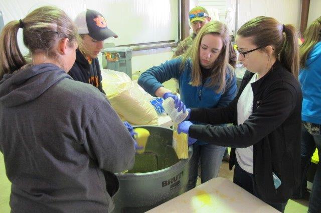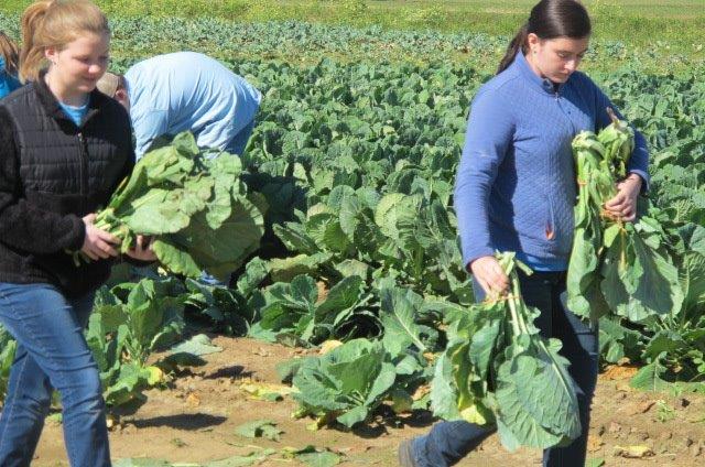 The greens were harvested in assembly line fashion — one student picking the greens, another bundling them with a rubber band and passed student to student to a waiting transport vehicle. Then teams of students worked to wash the greens. The students also bagged freshly ground corn meal and grits.