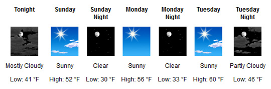 Monday Night: Mostly clear, with a low around 34. Northeast wind around 5 mph.