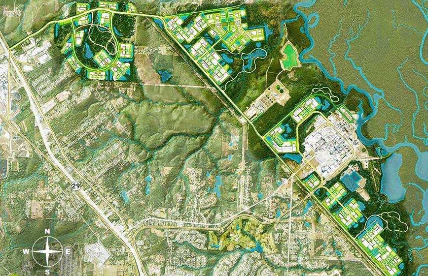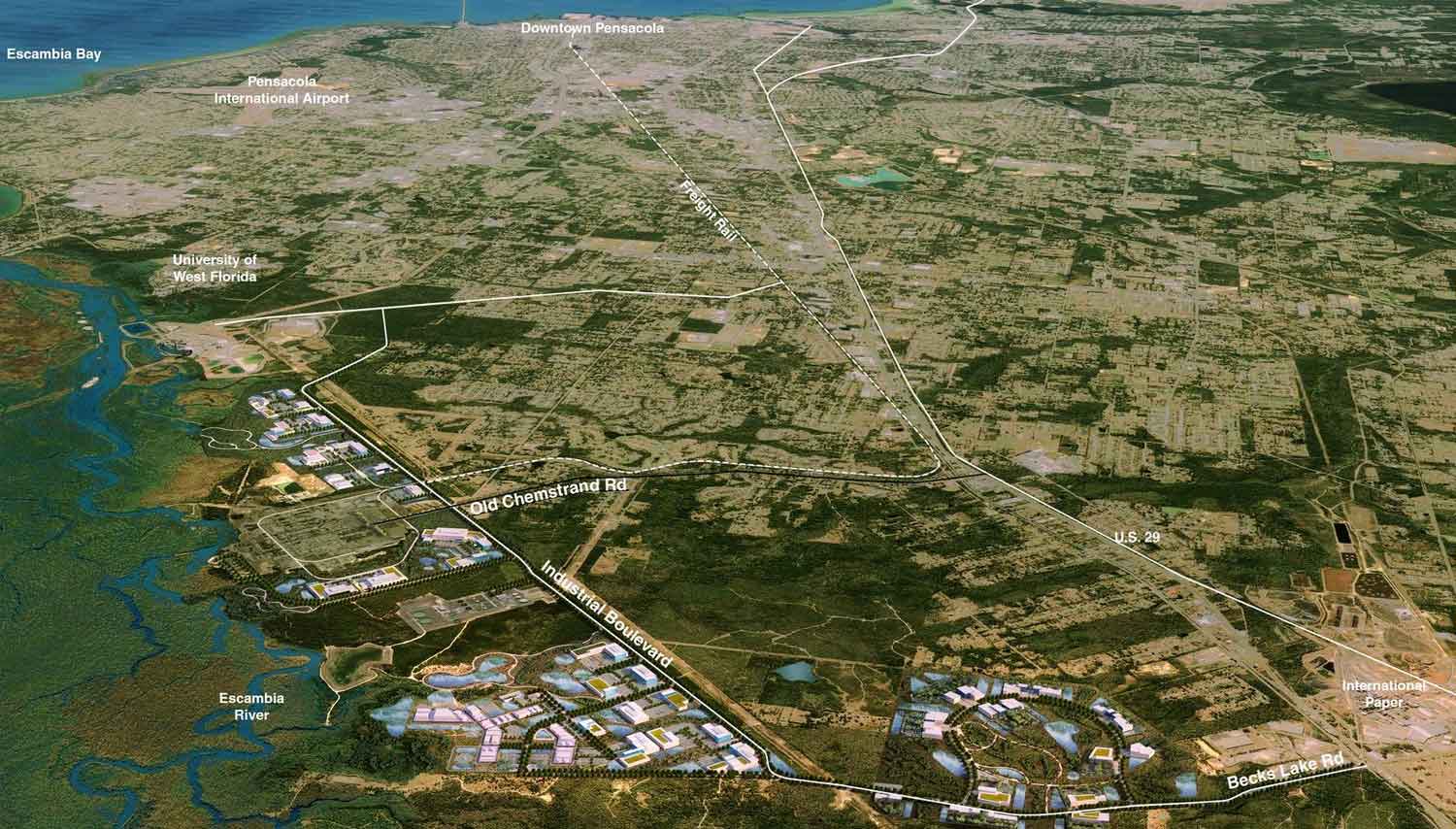 The public/private partnership is called “The Bluffs – Northwest Florida’s Industrial Campus”. The 6,000 acre master-planned development area includes about 1,700 acres of land that can be developed in an area east of Highway 29 bordered by the Escambia River to the east, Becks Lake Road near International Paper to the north, and the University of West Florida to the south. Although located along the Escambia River, most of the property to be developed is at a high elevation, about 100 feet above sea level, and not in a flood plain.