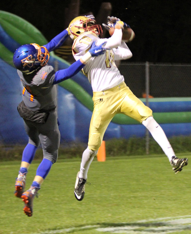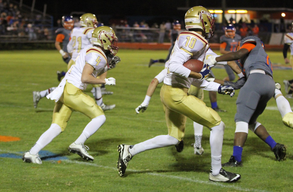 Pictured top: Northview’s Neikel Robinson picks of a Vernon pass in the end zone early in the Chiefs battle against Vernon. Pictured inset: Senior Jacob Dunsford gains yardage for the Chiefs. Pictured below: Robinson with the ball for the Chiefs. Pictured bottom: Luke Ward breaks free for Northview. NorthEscambia.com photos by Gary Amerson, click to enlarge.