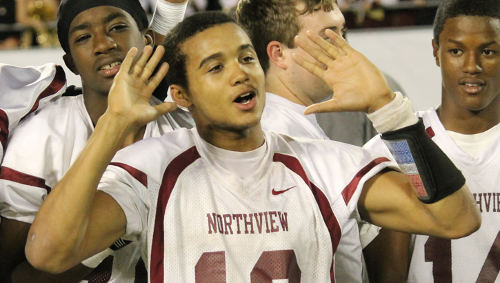 Pictured top: Neiko Robinson (14) played the last two seasons with Mississippi Gulf Coast Community. Courtesy photo. PiIctured below; Robinson celebrates after the Northview Chiefs won the 2012 Class 1A station championship in Orlando. NorthEscambia.com photo, click to enlarge.