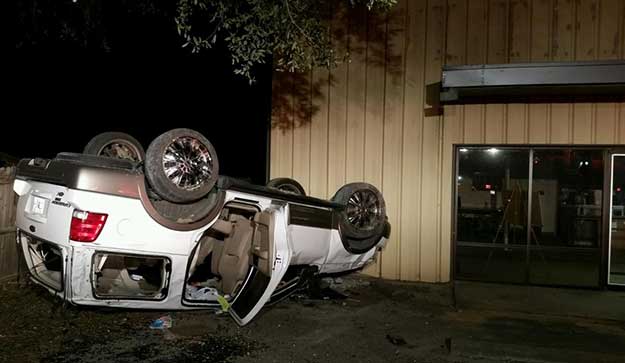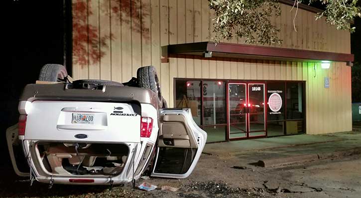 The driver of Ford Expedition lost control in the 10000 block of Chemstrand Road and overturned into the parking lot of Southern Bingo. The SUV caused minor damage to the building. There was not word on the condition of the driver, but their injuries were not considered life threatening.