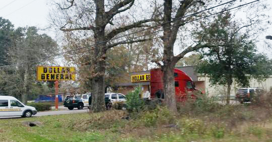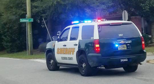 Pictured top and bottom: The scene shortly after an armed robbery at the Dollar General on Pine Forest Road just north of Highway 297A. Pictured directly below: Deputies, like this one on Pine Forest Road at Trailwood Drive, quickly established a perimeter around the store. NorthEscambia.com photos by Kristi Price, click to enlarge.