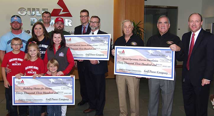 Gulf Power CEO and President Stan Connally recently presented checks to three organizations — Members of Building Homes for Heroes, the University of West Florida’s Military & Veterans Resource Center and the Special Operations Warrior Foundation. Each of these organizations supports veterans and their families. The charity proceeds were raised during the third annual Clay Shoot event in November at the Santa Rosa Shooting Center. More than $90,000 was distributed. Courtesy photo for NorthEscambia.com, click to enlarge.