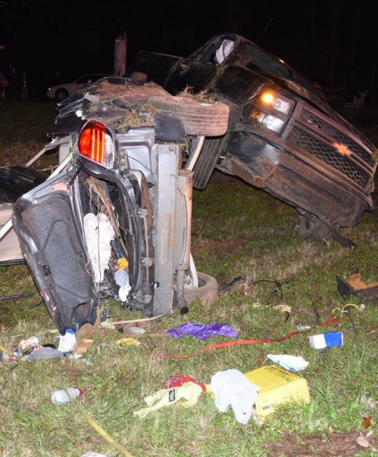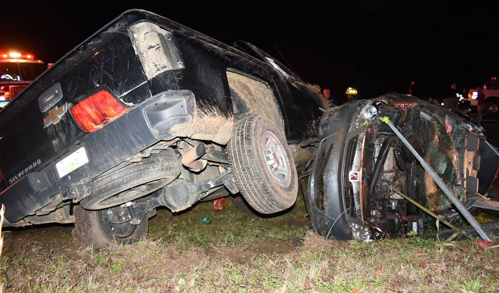 The cause of the accident was not immediately clear. But both vehicles overturned off Highway 29 near Rawhide Lane, just north of Highway 95A. At least one of the vehicles snapped a utility pole. One vehicle, a Saturn car, came to rest on its side while a Chevrolet Silverado pickup came to rest partially on the Saturn.