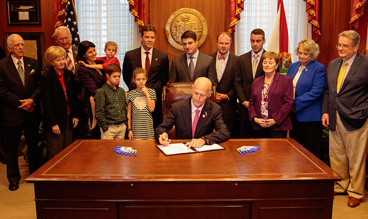 Pictured: Thursday, Governor Rick Scott was joined by Senate President Andy Gardiner, House Speaker Steve Crisafulli, their families, and other members of the Florida legislature to sign HB 7003 (Relating to Individuals with Disabilities), SB 672 (Educational Options) and SB 552 (Environmental Resources). Submitted photo for NorthEscambia.com, click to enlarge.