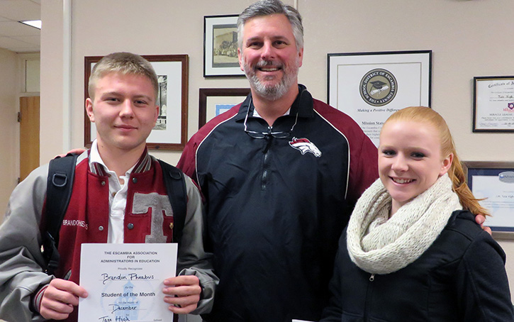 Tate High School has named Students of the Month for December. They are Brandon Pheabus and Grace Mills, pictured with Principal Rick Shackle. Photo for NorthEscambia.com, click to enlarge.